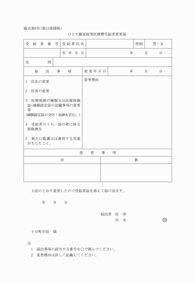 第13条 受給者は、次に掲げる事由が生じたときは、速やかにひとり親家庭等医療費受給者変更届(様式第8号)に受給者証を添えて市長に届け出なければならない。
