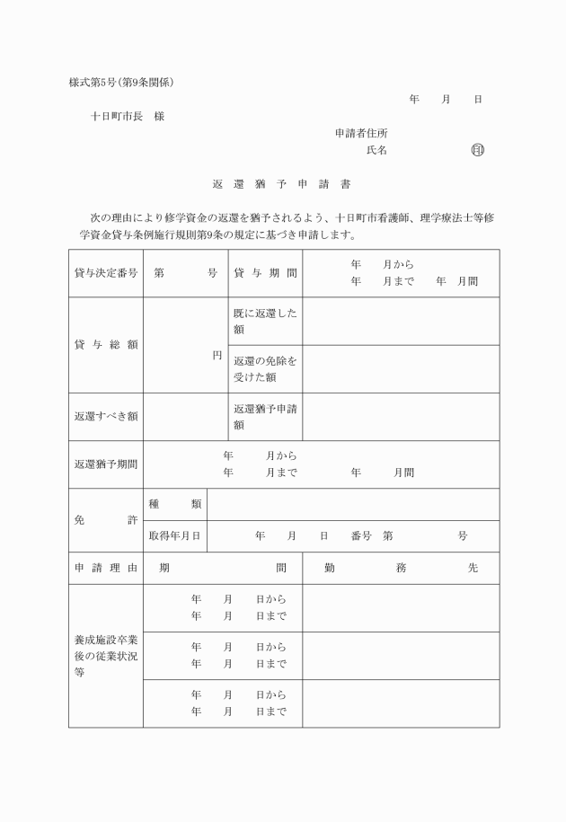 第8条 修学資金の貸与を受けた者は、修学資金を返還すべきこととなった日から2週間以内に修学資金返還明細書(様式第4号)を市長に提出しなければならない。