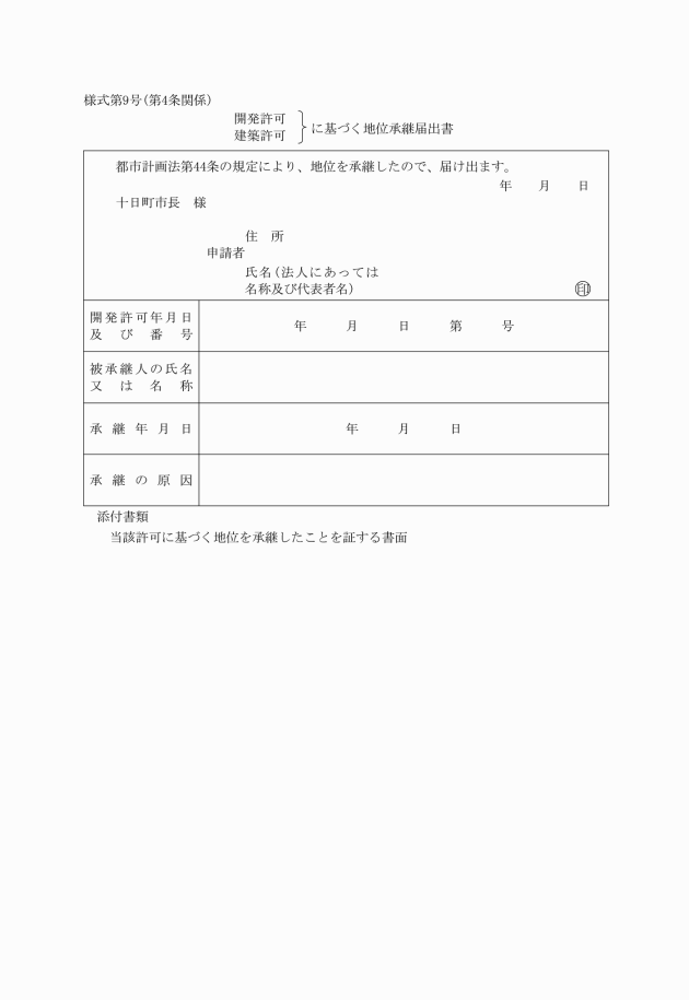 第4条 法第44条の規定による地位の承継があったときは、相続人その他の一般承継人は、速やかに様式第9号による届出書を市長に提出しなければならない。