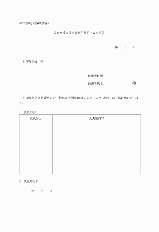 第6条 利用者の保護者は、利用契約の内容に変更があったときは、児童発達支援事業利用契約内容変更届(様式第6号)により、速やかに市長に届け出なければならない。