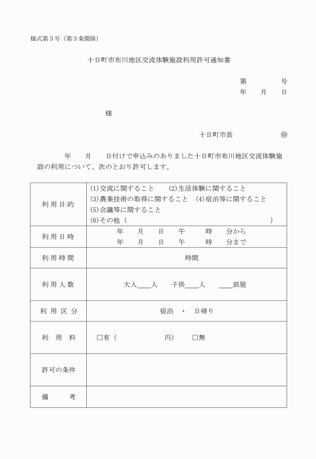 第1条 この規則は、十日町市布川地区交流体験施設条例(平成29年十日町市条例第1号。以下「条例」という。)の施行に関し必要な事項を定めるものとする。
