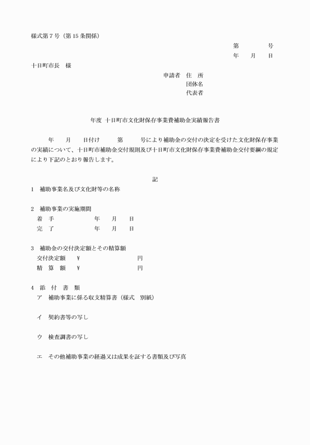第15条 補助事業者は、補助事業が完了した場合は、完了した日から起算して30日を経過する日又は当該補助事業の完了した日の属する年度の翌年度の4月10日のいずれか早い日までに、十日町市文化財保存事業費補助金実績報告書(様式第7号)を市長に提出しなければならない。