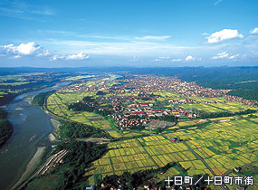 信濃川に沿って、縦長に広がる十日町の市街地。信濃川によって早くからひらけた肥よくな大地は、人を呼び、実りをもたらし、魚沼地方の中心地へと発展した。