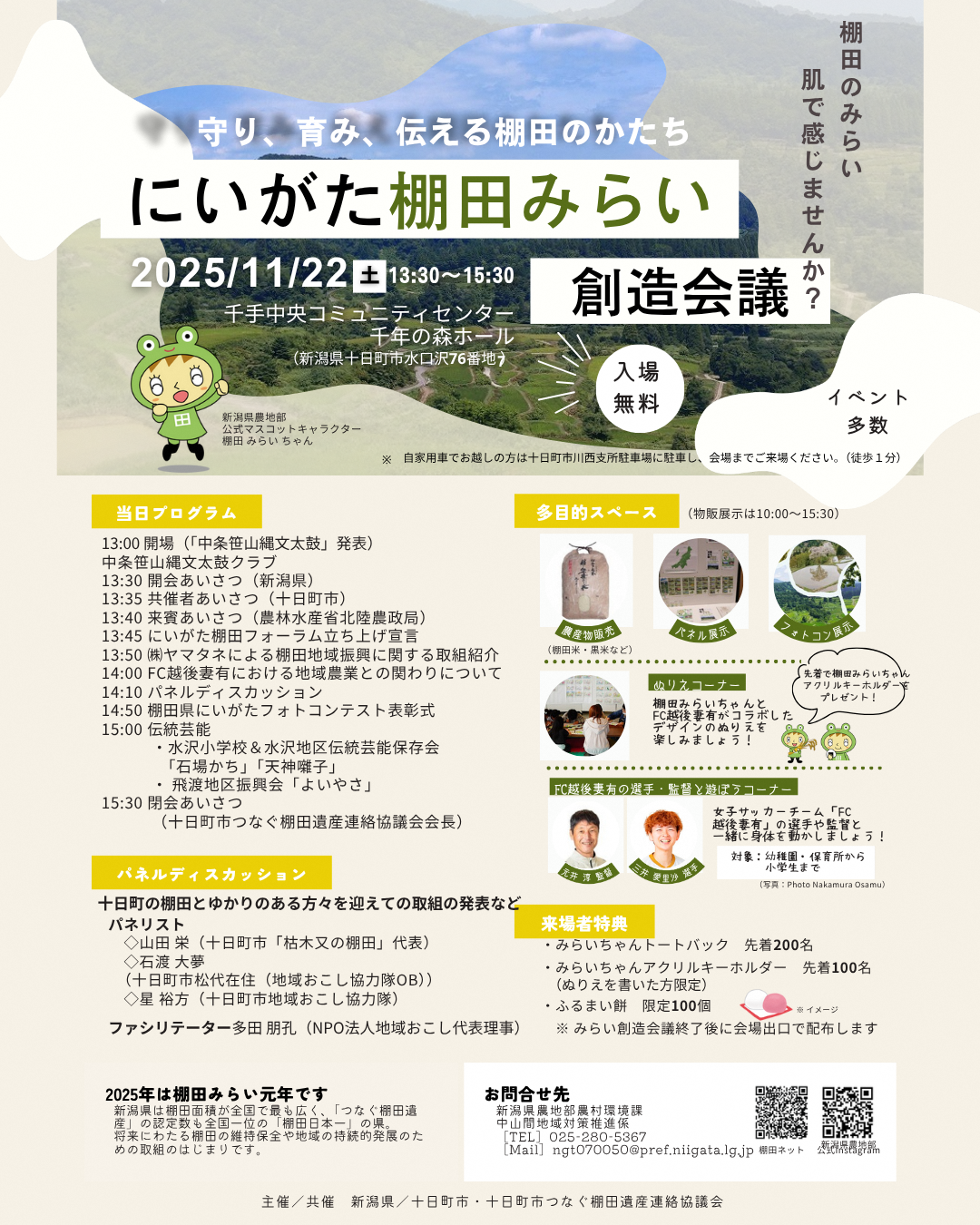 千手中央コミュニティセンターを会場に、企業や大学などの多様な主体が参画する「にいがた棚田フォーラム」の立上げ、「棚田県にいがたフォトコンテスト」の表彰、十日町市の棚田とゆかりのある人たちによる発表・パネルディスカッションなどが行われます。