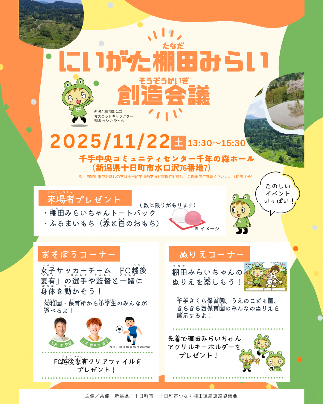 どなたでも参加いただけるイベントで、会場では農産物の販売、ぬり絵コーナー、FC越後妻有の監督・選手との交流、十日町市内の伝統芸能の披露などもお楽しみいただけます。ぜひご来場ください。