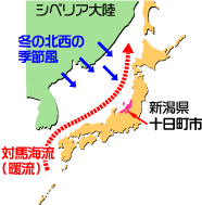冬の対馬海流は、新潟県沖で10℃くらいの温度があります。このため、対馬海流からは、温泉の湯気のように、たくさんの水蒸気が空に昇っていきます。